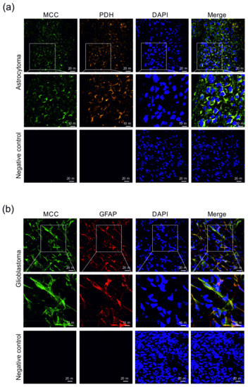 Immunohistochemical detection of the presence of 3-methylcrotonyl-CoA carboxylase (MCC) in human astrocytoma (a) and glioblastoma (b) sections. 3-methylcrotonyl-CoA carboxylase in the cells was immunofluorescently labeled with primary anti-MCC rabbit polyclonal antibodies followed by affinity-purified secondary antibodies conjugated to Alexa Fluor 488 (green). The presence of pyruvate dehydrogenase (PDH) among astrocytoma cells (a) was immunofluorescently labeled with primary anti-PDH human polyclonal antibodies followed by affinity-purified secondary antibodies conjugated to TRITC (orange). Mouse monoclonal antibodies were applied to detect GFAP (red) in cells of glioblastoma (b). Nuclei were visualized using DAPI intercalating fluorochrome (DAPI; blue). Merged views of the MCC, PDH, and DAPI are represented in the merge (yellow). Negative control was made by using secondary antibodies without primary antibodies (negative control). The scale bars represent either 20 or 10 μm.
