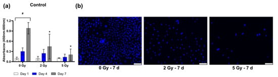 Keratinocyte viability after irradiation of the control groups without growth factor treatment: (a) Y–axis shows absorbance on 1 d, 4 d, and 7 d after 0, 2, 5 Gy irradiation; (b) representative images of irradiated keratinocytes without growth factor supplementation at time point 7 d stained with DAPI (blue = living cells). * p ≤ 0.05, significances were correlated to the non-irradiated respective control. * = significant compared to the control without growth factors in the respective irradiation dose at the respective time point. # = significances were correlated to the control on day 1. Scale bar 100 µm.