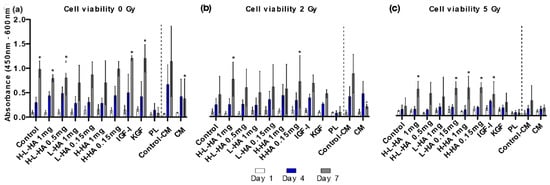 The cell viability was reviewed on 1 d, 4 d, and 7 d to analyze the influence of irradiation on the keratinocyte viability. All the control groups, 0 Gy, 2 Gy, and 5 Gy without addition of growth factors, showed an increase in cell viability over time (Figure 1a).