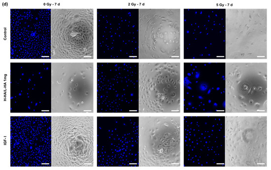 Live-dead-apoptotic staining revealed an increase in dead and apoptotic cells after irradiation. When treated with 1 mg H-HA/L-HA and 100 ng/mL IGF-I, a higher number of living cells and a lower amount of dead apoptotic cells were visible in the 2 Gy and 5 Gy groups (Figure 6d).