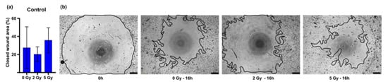 Keratinocyte migration of the irradiated control groups without growth factor treatment: (a) Y-axis shows closed wound area at time point 16 h after 0, 2, 5 Gy irradiation; (b) representative images of irradiated keratinocytes at time point 0 h and 16 h. Scale bar 200 µm.