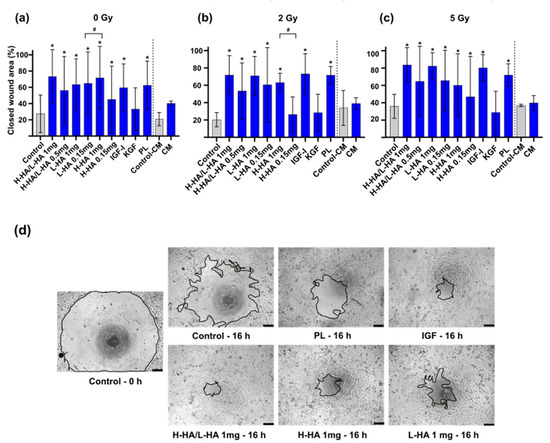 Keratinocyte migration of the irradiation groups 0, 2, and 5 Gy with growth factors after 16 h: (a) Y-axis shows closed wound area without irradiation; (b) Y-axis shows closed wound area after 2 Gy irradiation; (c) Y-axis shows closed wound area after 5 Gy irradiation; (d) representative images of irradiated keratinocytes at time point 0 h and 16 h. p ≤ 0.05, significances were correlated to the respective control. * = significant compared to the control without growth factors in the respective irradiation dose at the respective time point. # = significant compared to the lower dose of HA. Scale bar 200 µm.