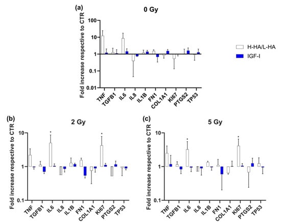The gene expression of the irradiated cells was analyzed 24 h after treatment with 1 mg/mL H-HA/L-HA or 100 ng/mL IGF-I (Figure 5). There was a higher expression of TNF and a clearly significant higher expression of IL6 and MKI67 after treatment with 1 mg/mL H-HA/L-HA compared to the control in both irradiation groups (7.13- and 5.76-fold after 2 Gy irradiation, 4.40- and 5.50-fold after 5 Gy irradiation) (Figure 5b,c).