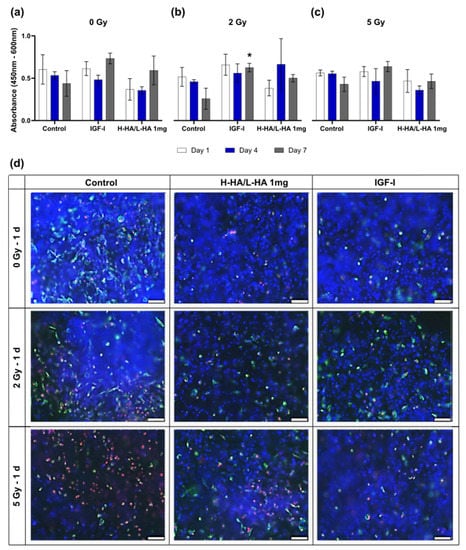 Keratinocyte viability on 3D MatriDerm® collagen-elastin scaffolds of the irradiation groups 0, 2, and 5 Gy with 1 mg/mL H-HA/L-HA and 100 ng/mL IGF-I supplementation on 1 d, 4 d, and 7 d: (a) cell viability without irradiation; (b) cell viability after irradiation with 2 Gy; (c) cell viability after irradiation with 5 Gy; (d) representative images of irradiated keratinocytes at time point 1 d (living = blue, apoptotic = green, dead = red). * p ≤ 0.05, significances were correlated to the respective control. * = significant compared to the control without growth factors in the respective irradiation dose at the respective time point. Scale bar 100 µm.