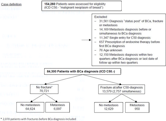 From the original cohort of 154,260 individuals we excluded patients as follows (Figure 1): (i) 31,561 patients whose first diagnosis has been tagged with the German ICD-modification “status post” [], i.e., prevalent cases, (ii) 14,169 patients who were diagnosed for metastasis prior or simultaneously (within one quarter) to the initial BCa diagnosis, (iii) 11,374 patients with a BCa diagnosis in only a single record were excluded due to a potentially false BCa diagnosis, (iv) 657 individuals with endocrine therapy prior to BCa diagnosis, (v) 76 with missing age and (vi) 12,150 patients with a follow-up time of less than six months. Finally, we included 84,300 patients in the main analysis for overall metastasis (Figure 1). The number of patients excluded due to short follow-up varied according to the outcome; it was 10,664 for lymph node metastasis, 7761 for distant bone metastasis and 8689 for non-bone metastasis, respectively.