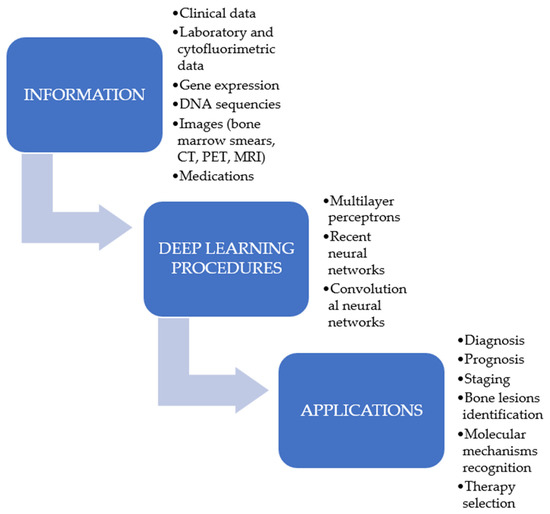 In the last few years, the application of ML algorithms and DL procedures to detect tumours has been progressively increased [17,18,19,20] (Figure 2), as they have the capability to use a mixture of proteomic, genomic, histopathology data, or images to manage cancer patients. However, the aim of DL or ML is not to replace the human ability but to provide a decision support to oncologists in their practice [21]. These procedures have been demonstrated to represent an advantageous support not only in the area of solid neoplasms but also in the management of the haematological patients. Recently, several reports have shown their importance in the diagnosis, prognosis, and therapeutic evaluation of haematological neoplasms. In light of such considerations, the purpose of this review is to present the most recent results concerning the use of these computational techniques in the management of a particular form of haematological neoplasia, namely the multiple myeloma (MM). MM was selected since it represents a haematological tumour provoked by the clonal proliferation of plasma cells with an increasing prevalence, accounting for more than 140,000 subjects diagnosed per year. Furthermore, whereas the survival after a diagnosis of MM has enhanced, the tumour has basically a negative outcome [22,23].