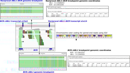 - Richebourg, S.; Eclache, V.; Perot, C.; Portnoi, M.-F.; Akker, J.V.D.; Terre, C.; Maareck, O.; Soenen, V.; Viguié, F.; Lai, J.-L.; et al. Mechanisms of genesis of variant translocation in chronic myeloid leukemia are not correlated with ABL1 or BCR deletion status or response to imatinib therapy. Cancer Genet. Cytogenet. 2008, 182, 95–102. [Google Scholar] [CrossRef] [PubMed]