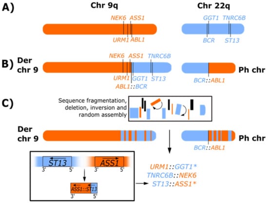 Representation of Ph-associated rearrangements formed as a result of chromoplexy-like events. (A) Representation of the q arms of normal chromosomes (chr) 9 and 22. (B) Classical Ph chromosome and derivative (Der) chromosome 9 formed by a reciprocal translocation in CML. (C) Representation of Ph-associated rearrangements observed for patient 24 of our whole exome sequencing, RNA-seq and copy number variation analysis [11] where multiple novel gene fusions were detected. The location and orientation of the gene fusions suggest that segments of chromosome 9 (orange) and chromosome 22 (blue) fragmented during the formation of the Ph chromosome, which resulted in the loss of genetic material (indicated in black), inversion (indicated by arc arrows and denoted with (*), and random reassembly of sequence that generated novel fusions. Using ST13:ASS1 as a model, the fusion was formed following the deletion of sequence adjacent to ST13 on chromosome 22 and ASS1 on chromosome 9, and complex rearrangement involving inversion (denoted with (*) and reassembly of sequence that brought the genes into the same transcriptional orientation. The arrows in the lower box indicate the original transcriptional direction of the genes on their respective chromosomes and the transcriptional direction after deletion, inversion, and sequence reassembly. Consistent with other patients with Ph-associated rearrangements, the reciprocal ABL1::BCR transcript on derivative 9 was not detected due to disruption and deletion of adjacent sequence. The complete sequence of events is not fully resolved, but the positioning of the fusion partners of the novel fusions suggests that sequence fragmentation may have occurred on both the derivative 9 and the Ph chromosome, and the novel fusions may be located on derivative 9 or the Ph chromosome.