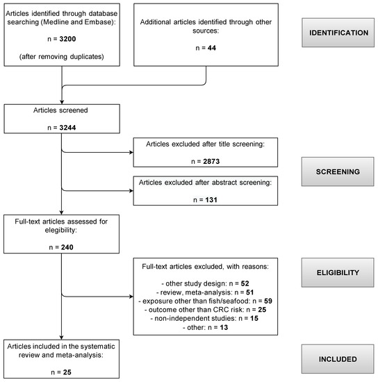 Recently, findings from large population-based cohort studies have been published [13,14]; hence, conducting an updated meta-analysis seems appropriate and timely. Moreover, we believe that coupling the evidence from epidemiological studies with that from preclinical studies may greatly help to jointly evaluate the robustness and plausibility of the hypothesis under study. Therefore, we conducted an up-to-date meta-analysis of prospective studies on the association between fish consumption and CRC risk among humans and a review of the available evidence on the link between the intake of fish and fish components and colorectal carcinogenesis in animal models.