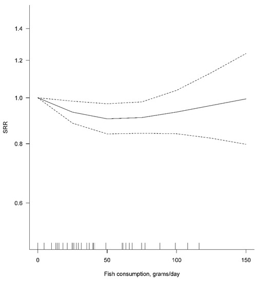 Non-linear dose–response meta-analysis for the association between fish consumption (g/day) and colorectal cancer risk. SRR: summary relative risk.