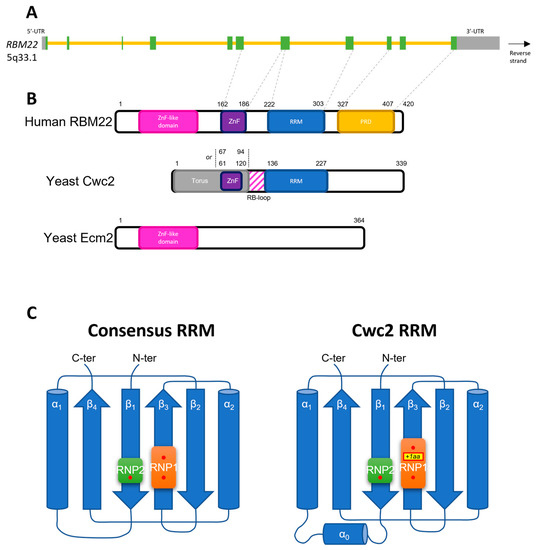(A) Scheme of RBM22 gene. Exons are represented by green and grey boxes when they are translated and are either in the 5′-UTR or 3′-UTR, respectively. Introns are represented by yellow lines. The correspondence of exons with the domains of the protein is indicated, when known, with the grey dashed line between (A) and (B); (B) Scheme of the domains of the human protein RBM22 and the two yeast proteins Cwc2 and Ecm2. The structural homology between the three proteins suggests that RBM22 is a fusion gene of the two yeast genes; (C) Two-dimension representation of the structure of the RNA-Recognition Motif (RRM). Left panel shows the consensus structure of the RRM. Right panel shows the RRM of Cwc2, the yeast orthologue of RBM22. The latter presents an additional amino acid between the two aromatic residues of RNP1, and another α-helix between β1 and α1. The aromatic residues of the RNP subdomains are represented by red dots. This 2D representation aims at respecting as much as possible the adjacent structures, as described in [10]. For this representation, the structures are annotated in a N-ter to C-ter manner, from 1 to 4. The α-helix 1 in the right panel corresponds to α-helix 9 in [141]. ZnF: Zinc Finger Domain; RRM: RNA-Recognition Motif; PRD: Proline-Rich Domain; Aa: Amino acid.