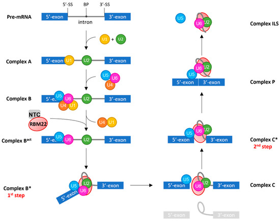 Simultaneously, the structure and conformation of the complex is sequentially remodeled by DExD/H-box ATPases/Helicases (and successively named complex A, B, Bact, B*, C, C*, P, and ILS) with highly dynamic protein interactions. During these conformation changes, two transesterification steps will occur in order to remove the intron. The first transesterification step, called branching reaction, occurs in the catalytically activated B* complex and leads to the formation of an intron semi-lariat due to a nucleophilic attack from the 2′-hydroxyl of the adenosine in the BP on the guanosine of the 5′-SS [98,152,153]. Thus, in the C complex, the 3′-end of the 5′-exon is “free,” but yet, it is maintained in the spliceosome. In the transition C-to-C*, the complex gets catalytically activated for the second transesterification step, the exon ligation, in which another attack from the 3′-hydroxyl of the 5′-exon to the phosphate of the 3′-SS will occur. Thereby, in the post-catalytic complex (P), the two exons are ligated. They will then be removed from the complex, leaving the intron-lariat with the rest of the components; this is the Intron-Lariat Spliceosome Complex (ILS). Finally, all the components will be recycled for another splicing reaction on the same pre-mRNA or another one. The entire process is only possible thanks to the specific conformation adopted by the catalytic core of the spliceosome, at each step, which is governed by all its protein partners.