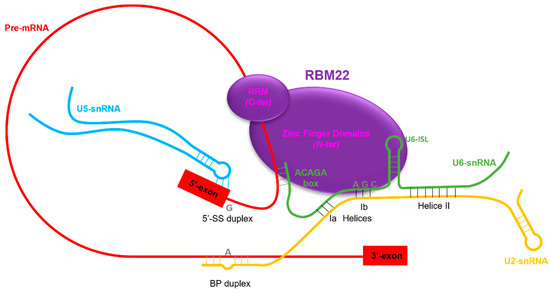 Nevertheless, RBM22 holds the pre-mRNA from its arrival, in the Bact complex, until the release of the intron lariat, in the ILS complex [29,97,98,99,100,101]. Additionally, RBM22 also contacts the U6-ISL. Interestingly, the bound between RBM22 and the U6-ISL is relatively weak in the Bact complex and becomes stronger during the first step of splicing [97]. This suggests a change of conformation of the U6-ISL during the first step of splicing, leading to a stronger binding by RBM22 [97,157]. Thus, by its N-terminal region and its contacts with several elements of the catalytic core, RBM22 plays the role of an “RNA-folder,” maintaining an active conformation during the first transesterification step of splicing. Indeed, several experiments showed that the absence of the yeast orthologue Cwc2 was critical for the catalytic core and the first step of splicing; a solution structure of the yeast U2/U6-snRNA complex showed that the three elements of the catalytic core were away from each other, in an unfolded conformation [157]. Likewise, an in vitro splicing experiment showed that spliceosomes lacking Cwc2 were unable to achieve the first step of splicing. The correct splicing could be restored when the spliceosomes were complemented with recombinant Cwc2 [97].