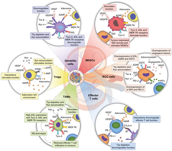 Expression of Tyro-3, MER-TK and AXL also occurs on tumour-associated macrophages. High AXL expression is associated with a shift towards an M2, immunosuppressive phenotype, and a decrease in effector immune cell infiltration in the RCC tumour microenvironment [27,38,39]. Microenvironmental adenosine, which is generated via CD39 and CD73 mediated conversion of adenosine triphosphate to adenosine (Figure 1), inhibits the antitumor function of various immune cells, including components of the adaptive and innate immune systems, by binding to cell surface A2AR [40,41,42]. Conversely, A2AR enhances the immunosuppressive activity of myeloid and regulatory T cells [43].