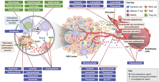 VEGF-targeted anti-angiogenics inhibit VEGF signalling, thereby blocking its pro-angiogenic and immunomodulatory functions within the tumour microenvironment [3,4]. TKIs are small molecules that inhibit VEGFR by binding to its active domain, and include agents such as sorafenib, pazopanib, sunitinib, axitinib, cabozantinib, lenvatinib, and tivozanib [3] (Figure 2; Supplementary Table S2). Anti-VEGF mAbs, such as bevacizumab, bind directly to VEGF and prevent its interaction with VEGFR [3] (Figure 2; Supplementary Table S2). In aRCC, blocking of VEGFR by TKIs has been shown to result in a number of physiological changes, including reduced blood vessel density, alterations in pericyte coverage, and decreased tumour perfusion, which may lead to acute infarction of the VEGF-dependent tumour microenvironment and tumour necrosis [48,49,50,51]. Vascular remodelling without necrosis that can lead to enhanced T cell infiltration of the tumour microenvironment has also been observed with these agents [50,52].