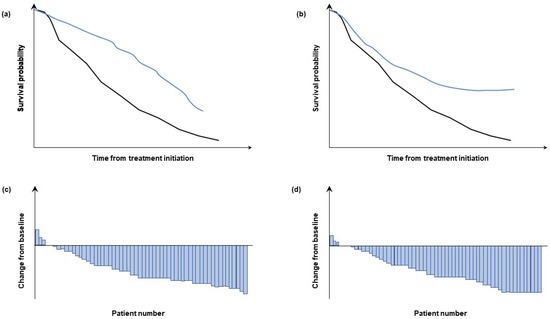 Illustration of the implications of meaningful clinical read out selection for establishing the potential additive versus synergistic effects of anti-VEGF and CPI therapies. Kaplan–Meier curves showing (vs. black reference group) a continued drop off (a) versus a plateau (b) and waterfall plots (c,d) with differing shoulders but the same median. CPI, checkpoint inhibitor; VEGF, vascular endothelial growth factor.
