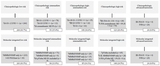 Distribution of ESGO-ESTRO-ESP 2021 risk groups by the ProMisE classifier (n = 604). Abbreviations: G, histologic grade; LVSI +/−, lymphovascular space invasion focal or negative; LVSI +++, lymphovascular space invasion substantial; MI, myometrial invasion; MMRd, mismatch repair deficient; NSMP, no specific molecular profile; POLE, polymerase-ϵ; p53abn, p53 abnormal; R, residual tumor.