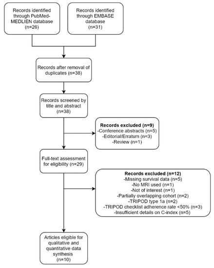A flow diagram of the selection process is depicted in Figure 1. A total of 38 unique articles were screened based on their titles and abstracts. Nine articles, including five conference abstracts, three editorials/errata, and one review, were excluded. The full texts of the remaining 29 articles were then thoroughly reviewed. An additional 12 articles were excluded because the studies reported in them were not conducted using MRI (n = 1), not in the field of interest (n = 1), were missing survival information (n = 5), had partially overlapping cohorts (n = 2), or involved the analysis of TRIPOD type 1a predictive models (n = 2). Of the two studies with overlapping cohorts, the one with a larger sample size was selected. Finally, 10 studies that met the eligibility criteria were included for data synthesis [11,12,26,27,28,29,30,31,32,33].