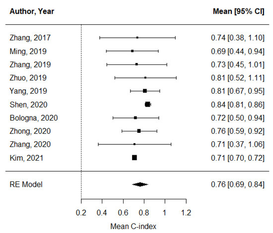 The pooled estimate of C-indices for PFS was 0.76 (95% CI, 0.69–0.84) (Figure 2). In addition, there was significant heterogeneity among the studies (I2 = 89.2%; Cochran’s Q method, p < 0.001). No publication bias was observed upon visual inspection of the funnel plot (Figure 3); the results of Egger’s test showed no bias as well (p = 0.73).