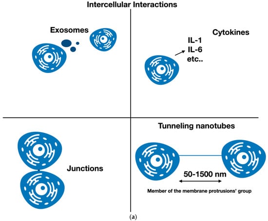 Intercellular interactions perform an essential action in tissue homeostasis, and are a critical element for cells and tissues growth. In fact, as biological complexity increases, cells must elaborate diverse and more advanced systems to transfer temporal and spatial data. This cell–cell interaction can occur both through the extracellular space, with the production and release of exosomes, cytokines, and other mediators, and through cell–cell contacts that facilitate the association between two cytoplasm (Figure 1a). These types of intercellular interactions are most efficient over brief distances [1,2,3].