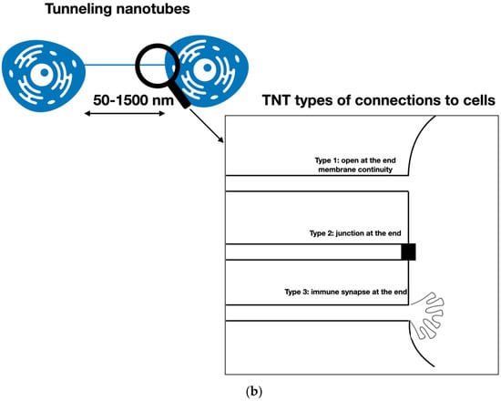Tunneling nanotubes (TNTs) are a new form of direct contact interaction among cells, as they help cells to “talk” directly with each other over lengthier spaces [4,5,6] (Figure 1a). This breakthrough contested the classical view of cells, the basic unit of organisms, as separate elements. The detection of TNTs launched the notion of super-cellularity, which permits the quick stability of metabolic requirements, as well as stress elements and organelles, via long-distance transfers between cells not closely in contact; therefore, TNTs make quick reactions between cells possible despite the diversity of type of cells and tissues [7].