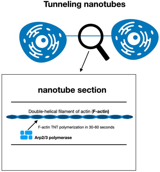 F-actin depolymerization substances stop TNT generation, and TNTs are unstable transient formations that can polymerize and depolymerize rapidly in 30–60 s [21,22], with a lifetime oscillating from only some minutes up to numerous hours [23,24,25] (Figure 2).