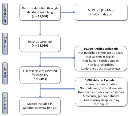 A review of the literature was performed following the Preferred Reporting Items for Systematic Reviews and Meta-Analysis (PRISMA) guidelines []. A database search was conducted in MEDLINE/PubMed (National Center for Biotechnology Information, NCBI) and clinicaltrials.gov, ending on 31 March 2021. Databases were searched for the following terms: “head and neck cancer”, OR “oral cancer,” OR “tongue cancer”, OR “thyroid cancer”, OR “lymph node”, OR “salivary gland”, OR “parotid gland,” AND “ultrasound,” AND “radiomics” OR “texture analysis”.