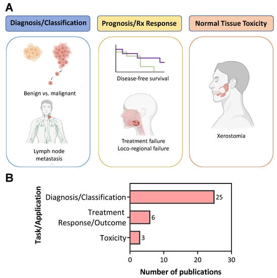 Current applications of US radiomics in head and neck oncology. (A) Diagnostic applications (left) based on histopathologic findings for the differentiation of benign and malignant thyroid nodules, as well as the classification of lymph node metastasis. Prognostic applications (middle) based on patient outcomes, such as disease-free survival, or response to treatment (Rx response), such as locoregional recurrence. Prediction of treatment toxicity (right) due to salivary gland injury from radiation therapy. (B) Number of publications grouped by clinical task or application.