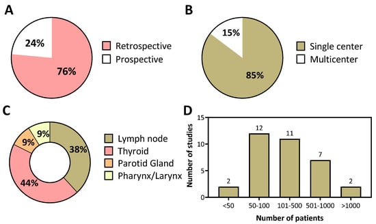 Design characteristics and sample sizes employed in US radiomics studies in head and neck cancer. (A) A majority of the published studies of US radiomics employed a retrospective design and (B) were conducted at a single center. (C) The thyroid glands represented the most common site imaged in these studies followed by the lymph nodes. (D) The number of patients evaluated in these published studies exhibited a wide range (12–1609) with a majority of studies (~60%) reporting analysis of data from over 100 patients.