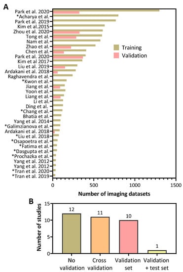 It is well recognized that the size of the imaging datasets used for training (i.e., number of datasets used to develop the model) critically influences the performance of ML models. Subsequent examination of the performance of developed ML models using an independent validation dataset (a cohort that provides an unbiased evaluation of a model) is also essential to assess their true utility. And finally, a test set is an external or independent sample of data that is used to report the performance of the algorithm once it has been trained and validated [,]. We, therefore, examined the number of imaging datasets employed for training and validation in published US radiomics studies [,,,,,,,,,,,,,,,,,,,,,,,,,,,,,,,,,] (Figure 4A). This analysis revealed a considerable degree of variability in the number of images used in the training (range 32–1299) datasets for developing the ML models. Notably, less than half of the studies included an independent validation dataset (n = 11, 32%). The majority of studies (Figure 4B) did not include a validation method to evaluate the performance of their model (n =12, 35%), or included cross-validation in their analyses (n = 11, 32%), Only a single study employed a validation and an independent test set. In studies that utilized a validation set, the number of images used in these validation datasets was considerably lower than the number of images in the training dataset (range 0 to 368). An asterisk (*) in front of a study name indicates that the authors used cross-validation as a means of validating their training model (Figure 4A).