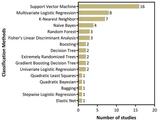 Next, we examined the ML methods employed in published US radiomic studies independent of the clinical application or the outcome measures studied (Figure 5). This analysis revealed that several studies employed more than one ML method in their analyses. The most commonly employed ML technique for classification was support vector machine (SVM) followed by multivariate logistic regression and k-nearest neighbor (kNN).