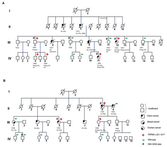 Pedigrees of colon cancer families. (A) Family 8 with CYBA c.246delC variant. (B) Family 11 with TRPM4 c.25-1 G > T variant.