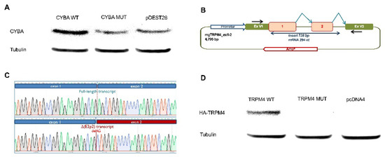 CYBA c.246delC and TRPM4 c.25-1G > T variants led to loss of the corresponding proteins. (A) Western blot detection of the CYBA protein in HEK293T transfected with wild-type (CYBA WT), mutated (CYBA MUT) or control plasmids (pDEST26). HEK293T cells transfected with the mutant CYBA plasmid expressed less protein compared to cells transfected with the wild-type CYBA plasmid. CYBA c.246delC-transfected cells expressed a similar amount of protein to those transfected with pDEST26 only. (B) Outline of the TRPM4 minigene construct. The black arrows in vector exons V1 and V2 indicate specific RT-PCR minigene primers; broken arrows represent the expected splicing reactions. (C) Sequencing traces of the transcripts generated by the wild-type (above) and mutant (c.25-1G > T) minigenes, suggesting that TRPM4 c.25-1G > T led to a frameshift transcript r.25_26del, that would be equivalent to c.25delAG. (D) TRPM4 c.25delAG led to the loss of TRPM4 protein. Western blot of TRPM3-HA Tag antibody in HEK293T cells transfected with wild-type, mutated or control plasmids. HEK293T cells transfected with pcDNA4TO-HA-TRPM4 c.25delAG (TRPM4 MUT) and pcDNA4 did not express any HA-TRPM4; only HEK293T cells transfected with wild-type pcDNA4TO-HA-TRPM4 (TRPM4 WT)-expressed HA-TRPM4.