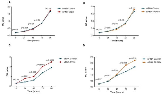 To study the effect of CYBA and TRPM4 on cell proliferation, we knocked down CYBA and TRPM4 with respective siRNAs, separately, in two colorectal adenocarcinoma cell lines, LS174T and HT-29; LS174T is a mucin secreting cell line. Moreover, qPCR and Western blot analysis confirmed the absence of CYBA or TRPM4 mRNA and protein expression in both LS174T and HT-29 cells (Supplementary Figure S3A–D). While knockdown of CYBA or TRPM4 did not seem to affect cell proliferation of LS174T cells in in vitro cell proliferation assay (Figure 3A,B), knockdown of CYBA or TRPM4 in the HT-29 cells led to an increase in cell proliferation throughout the time up to 96 h (Figure 3C,D; p < 0.05).
