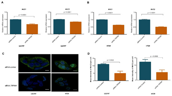In order to test the hypothesis that loss of TRPM4 disrupts the mucus barrier by inhibiting mucin secretion, we measured the expression of MUC1 and MUC2 by qPCR after downregulating TRPM4 in LS174T and HT-29 cell lines. The mRNA levels of MUC1 and MUC2 were decreased after knockdown TRPM4 in both LS174T and HT-29 cells (p ≤ 0.0001; Figure 4A,B). Moreover, the protein expression of MUC2, measured by immunofluorescence was decreased in both LS174T and HT-29 cells after the knockdown of TRPM4 compared to those treated with control siRNA (LS174T: p = 0.002; HT-29: p = 0.006; Figure 4C,D).