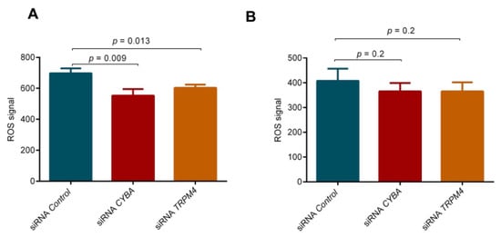 As CYBA is involved in ROS modulation, we measured the ROS activity in both LS174T and HT-29 cells after siRNA-mediated knockdown of CYBA or TRPM4. There was a small, but significant decrease in ROS activity in LS174T cells after the knockdown of CYBA or TRPM4 (p = 0.009 and 0.014; Figure 5A), but no decrease in HT-29 cells (Figure 5B).