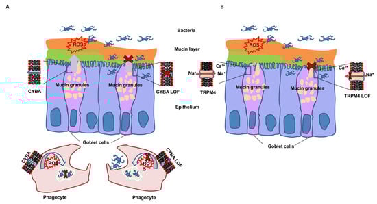 Schematic presentation of the suggested consequences of CYBA and TRPM4 variants on colonic mucin layer integrity. (A) The loss-of-function variant in CYBA leads to decreased ROS production and promotes CRC by faltering defense against intestinal bacteria at colonic epithelium and by suppressing bacterial killing by intestinal phagocytes. (B) The loss-of-function variant in TRPM4 leads to decreased mucus secretion due to inactivation of the TRPM4 channel, potentially leading to mucus-layer disruption with bacterial penetration into the mucin-protected epithelium, inflammation and colorectal cancer. The function of the wild-type CYBA and TRPM4 is shown in the left goblet cell; the function of CYBA and TRPM4 after the loss-of-function (LOF) variant is shown in the right goblet cell.