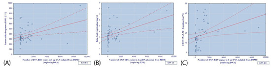 Relationship between the number of EBV DNA copies in 1 µg of DNA isolated from PBMCs and (A) the concentration of lactate dehydrogenase (U/L); (B) the concentration of beta-2-microglobulin (mg/L); (C) the percentage of CD19+/ZAP-70+ lymphocytes.
