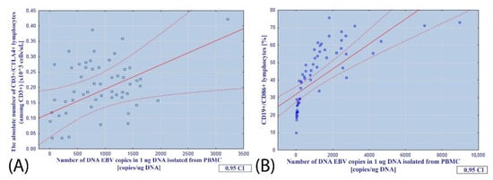 Relationship between the number of EBV DNA copies in 1 µg of DNA isolated from PBMCs and (A) the absolute number of CD3+/CTLA-4+ lymphocytes; (B) the percentage of CD19+/CD86+ lymphocytes in EBV(+) patients.