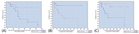 Kaplan–Meier curve illustrating the probability of progression-free survival (A) after diagnosis of CLL depending on the percentage of CD4+/CTLA-4+ lymphocytes; (B) after the initiation of CLL treatment depending on the percentage of CD8+/CTLA-4+ lymphocytes; (C) after the initiation of CLL treatment depending on the percentage of CD3+/CTLA-4+ lymphocytes.
