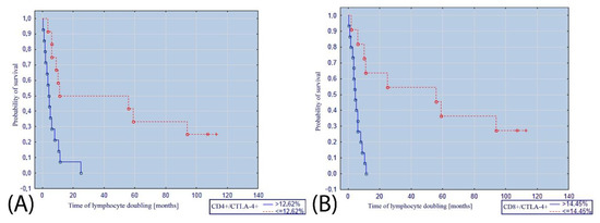 (A) Kaplan–Meier curve illustrating the probability of survival without doubling of the lymphocytosis depending on the percentage of (A) CD4+/CTLA-4+ lymphocytes; (B) CD8+/CTLA-4+ lymphocytes.