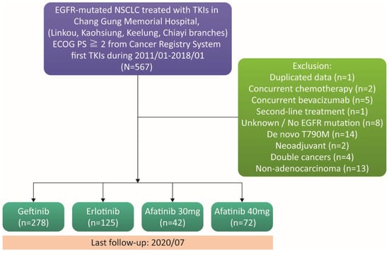 Patient data were obtained from the Cancer Registry System using the Chang Gung Research Database [22]. This study enrolled a total of 567 patients who were diagnosed with lung cancer; were assessed as ECOG-PS ≥ 2; harbored EGFR mutations; and were treated with EGFR-TKIs from January 2011 to January 2018. As this study aimed to examine patients treated with EGFR-TKI monotherapy for their first-line systemic treatment, those patients treated with concurrent chemotherapy (n = 2), concurrent bevacizumab (n = 5), second-line systemic treatment (n = 1), or neoadjuvant treatments (n = 2) were excluded. EGFR mutation status was retrospectively reviewed. Patients with a de novo T790M mutation (n = 14) and no or unknown EGFR mutation (n = 8) were excluded. Four patients with another active cancer and 13 patients with a non-adenocarcinoma history were excluded. Five hundred and seventeen lung adenocarcinoma patients treated with different EGFR-TKIs as first-line treatments were analyzed in this study, including 278, 125, and 114 patients treated with gefitinib, erlotinib, and afatinib, respectively. Gefitinib was prescribed at 250 mg daily and erlotinib was prescribed at 150 mg daily as a starting dose. The afatinib group was divided into two subgroups according to whether the starting dose was 30 mg (n = 42) or 40 mg (n = 72) daily. The patient selection process is summarized in Figure 1.