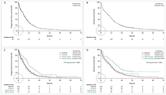 Kaplan–Meier survival curves indicating PFS (A,C) and OS (B,D) for all patients (A,B) and stratified according to the different EGFR-TKIs (C,D). EGFR-TKIs, epidermal growth factor receptor tyrosine kinase inhibitors; OS, overall survival; PFS, progression-free survival.