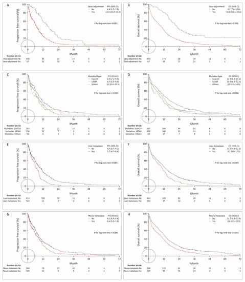 In addition to dose adjustment, the mutation status and the presence of liver and pleural metastases were independently unfavorable prognostic factors (Figure 3 and Table 2 and Table 3). Lung adenocarcinoma patients who harbor the exon 19 deletion are known to present with better survival than patients with the exon 21 L858R mutation [31,32]. Patients with liver and pleural metastases had worse survival outcomes, which agrees with the outcomes of previous studies [33,34,35].