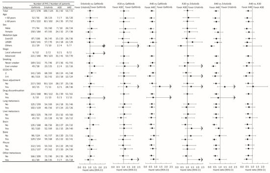 Subgroup analysis comparing progression-free survival among the different epidermal growth factor receptor tyrosine kinase inhibitors treatments, stratified by selected baseline characteristics.