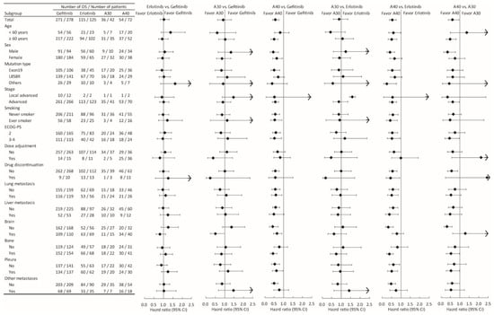 Subgroup analysis comparing overall survival among the different epidermal growth factor receptor tyrosine kinase inhibitors treatments, stratified by selected baseline characteristics.