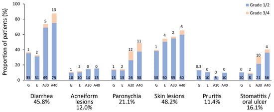 The distribution of AEs (≥10%) according to treatment groups is displayed in Figure 6. The most frequently reported AE was diarrhea (45.8%), then skin lesions (48.2%), paronychia (21.1%), and stomatitis/oral ulcer (16.1%). Most AEs were considered mild (Grade 1 or 2) and manageable. In terms of severe AEs (Grade ≥ 3), paronychia (3.5%) was the most frequently reported event, followed by diarrhea (3.3%), skin rashes (2.7%), and stomatitis/oral ulcer (1.9%). Overall, AE grades, including severe AEs, were more likely to be associated with either 30 or 40 mg afatinib (particularly 40 mg afatinib) compared with gefitinib treatment (Figure 6 and Tables S2 and S3).
