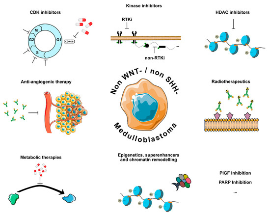 In addition to the treatment approaches discussed thus far, several other concepts should be mentioned briefly (Table 1). Firstly, the inhibition of placental growth factor (PGF) has been proposed as a promising strategy across all MB subgroups and was tested in a phase I trial using the monoclonal antibody TB-403 (NCT02748135) [162]. The results have been presented at the AACR annual meeting 2021 and were encouraging both in terms of safety and efficacy according to the producing company; however, a peer-reviewed publication is not available to date [163]. Another interesting treatment approach represents the inhibition of DNA damage response pathways using poly (ADP-ribose) polymerase (PARP) inhibitors, a relatively new drug class that has received numerous approvals for breast and ovarian cancer patients with germline BRCA1/2 mutations in the last years [164]. This could be especially relevant to a subset Gr. 3/4 MB, since these are the molecular groups that are enriched for (germline) BRCA2- and PALB2-mutations [13,16]. Thus, it will be interesting to see whether non-WNT/non-SHH patients will be included in currently running trials using PARP inhibitors (NCT03233204 and NCT04236414). Lastly, several preclinical studies with different compounds indicate that the concept of sensitizing cancer cells to radiotherapy using small molecules could be potentially interesting for non-WNT/non-SHH MB [165,166,167]