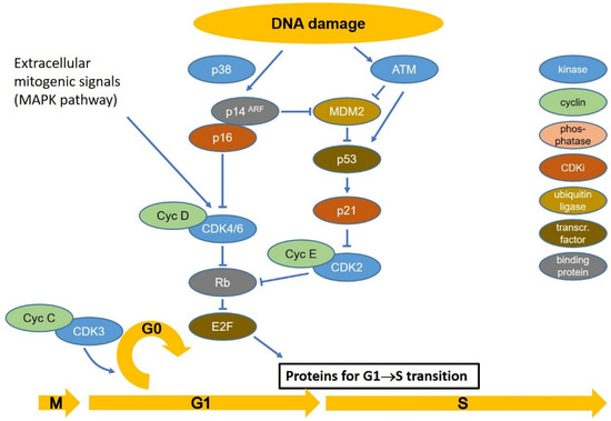 Schematic diagram of the signals regulating the transition of cells from quiescence (G0) to replication in the S-phase and stress-induced arrest at the G1-S transition. Pointed arrows symbolize functional activation, arrows ending with a line symbolize inhibition. In quiescent cells, the RB protein binds to the transcription factor E2F keeping it in an inactive state. Mitogenic signaling causes mono-phosphorylation of RB by the cyclin D-CDK4/6 kinase in early G1 and multiple phosphorylations in late G1, which inactivates RB releasing E2F to transcribe genes for proteins required in S. p53 is continuously expressed but is kept at a low level by binding of the E3 ubiquitin ligase, MDM2, which marks it for proteasomal degradation. The cyclin C-CDK3 complex mediates the transition from G1 to G0 (quiescence). DNA damage disrupts this binding by phosphorylation of MDM2 and p53, increasing p53 levels. P53 transcriptionally activates the CDK inhibitor p21 causing transient cell cycle arrest before the G1-S transition. If the damage is not repairable, the extended G1/S arrest may be reinforced by p16, which inhibits the cyclin D-CDK4/6 complex allowing RB to bind E2F and arrest the cells permanently in G1 (premature differentiation; senescence). The activity of transcription factors and enzymes is regulated by binding proteins and phosphorylation state. Different types of protein are shown in different colors. The active and inactive forms may be either phosphorylated or unphosphorylated, depending on the specific protein. For references, see text.