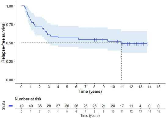 Relapse-free survival (RFS) for 49 rectal cancer patients with locally advanced or recurrent rectal adenocarcinoma.